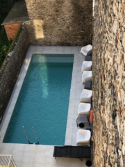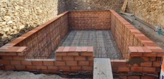 Création de la piscine de l’hôtel Carbonell à Llança. Gresite et coulis. Installation de moteurs et filtres dans la salle de billard.